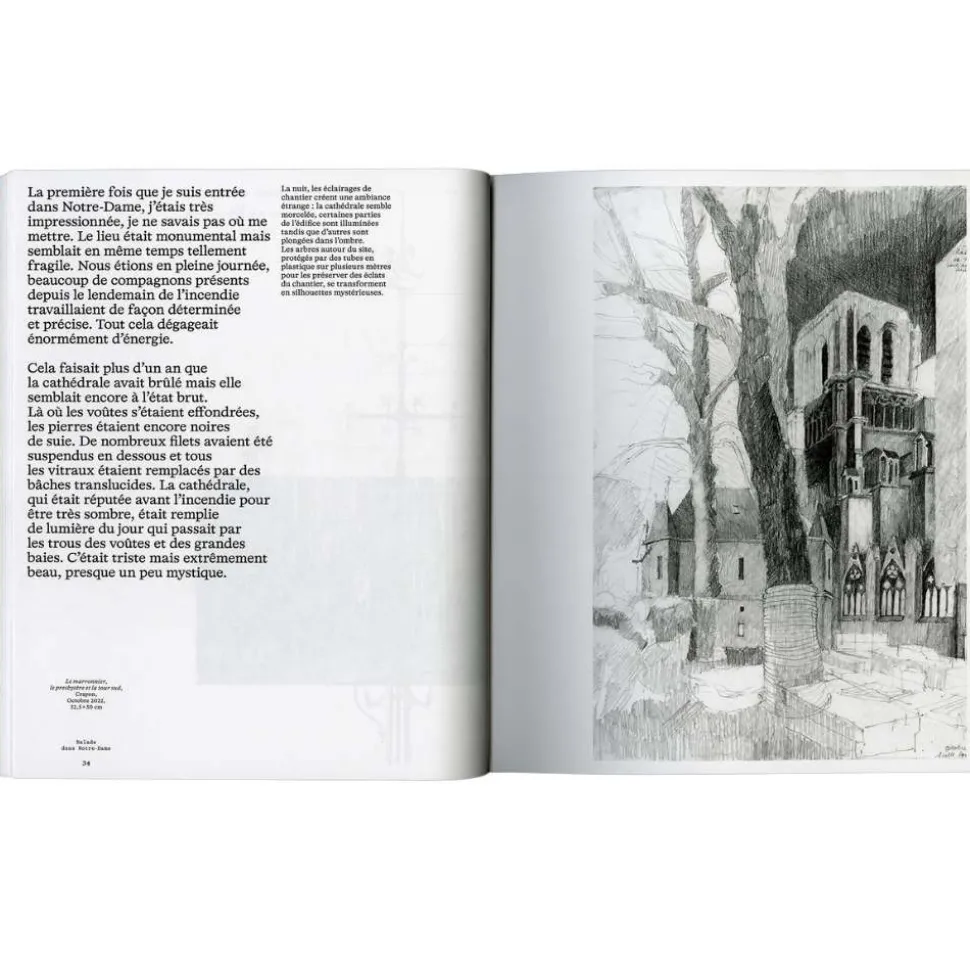 Ce livre d’architecture est enrichi de croquis de l’architecte Axelle Ponsonnet. Cette dernière étant grandement impliquée dans la reconstruction de Notre-Dame. Les dessins d’Axelle Ponsonnet sont accompagnés de texte en français pour s’immerger encore plus dans le chantier. Un livret est également présent pour des traductions en anglais.