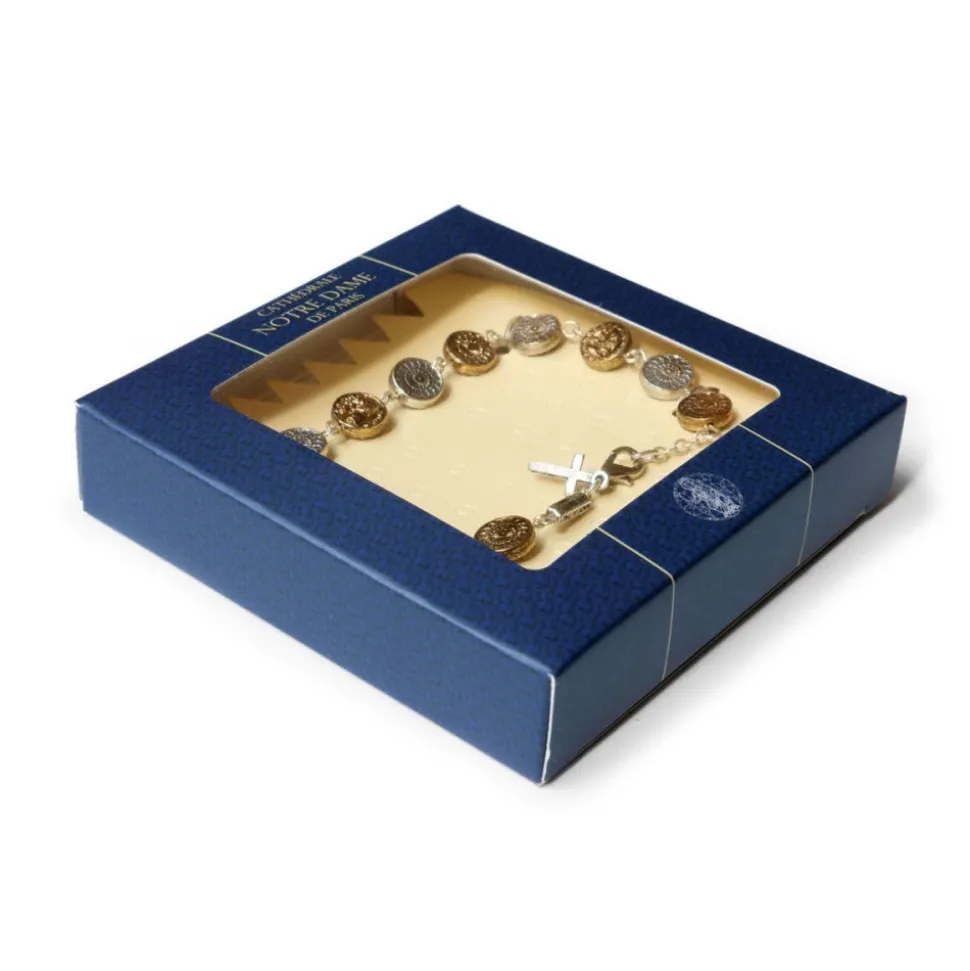 Magnifique bracelet dizainier réalisé avec des perles de métal représentant nos célèbres rosaces alternativement finition argent antique et or antique. Perles de métal 10mm, un bijou réalisé, exclusivement pour la cathédrale Notre-Dame de Paris. Sur ces perles nous observons la Vierge du pilier dite Notre Dame.