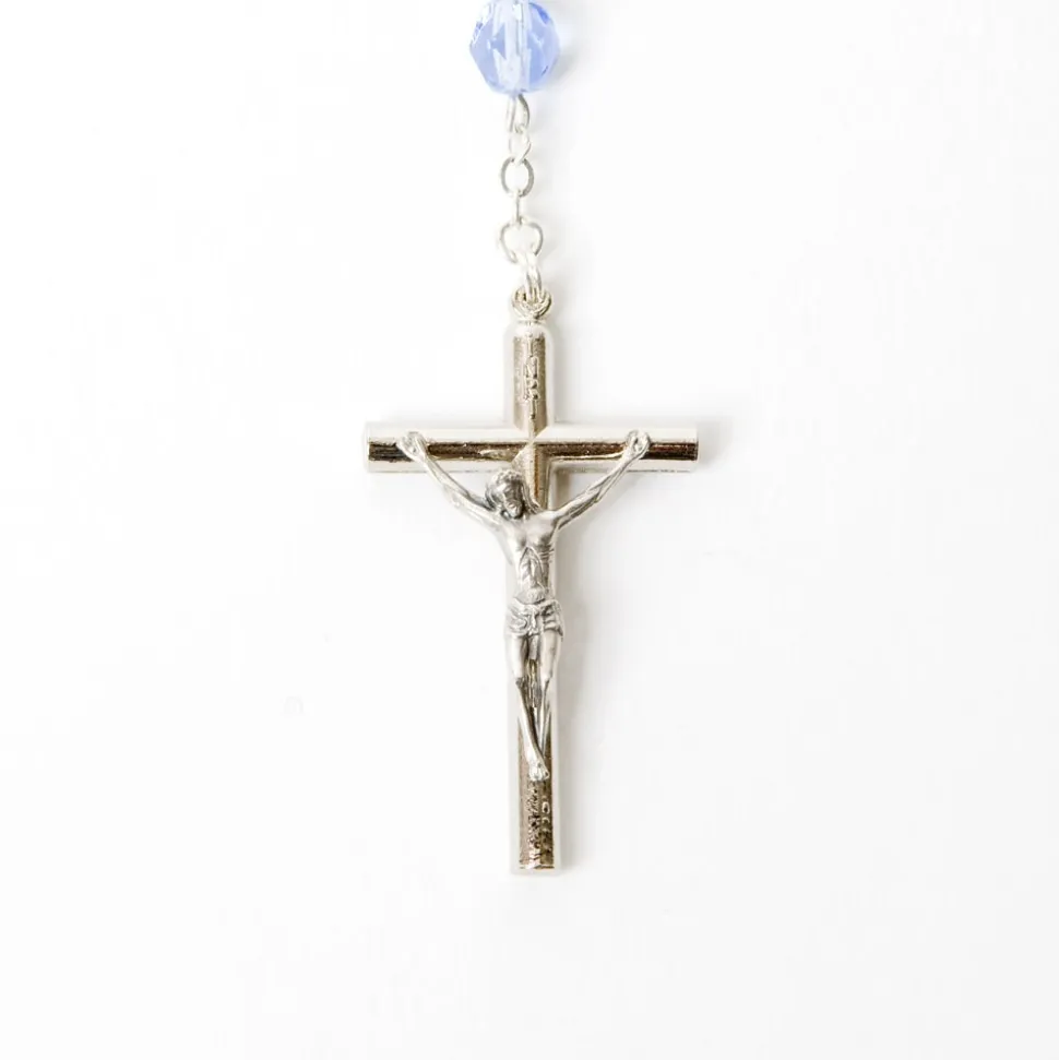 Offrez-vous ou offrez à quelqu’un de spécial une pièce alliant beauté, qualité et spiritualité avec notre chapelet en perles de verre facettées bleues transparentes.
