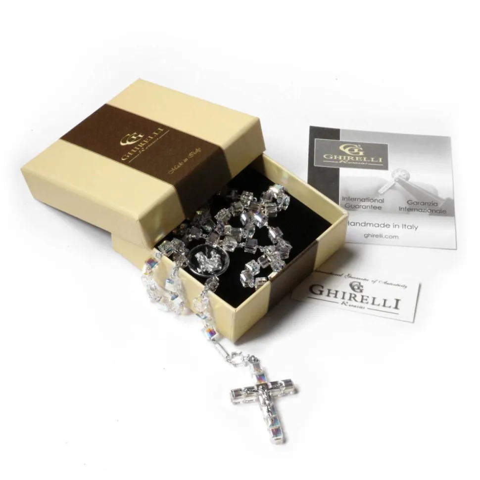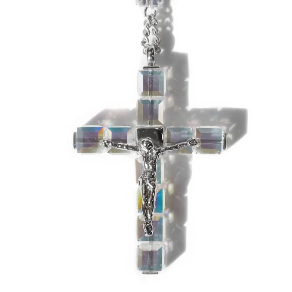 Magnifique chapelet Swarovski en perles carrées en argent 925. Un chapelet précieux réalisé avec des cubes de cristal Swarovski irisé. Le fil et la chaîne diamantée sont en argent 925° rhodié. La croix est réalisée avec les mêmes cubes de cristal irisé. Son cœur délicatement sculpté, représente la Vierge du Pilier, la célèbre statue vénérée à Notre-Dame de Paris. Cette pièce incarne l’héritage spirituel et artistique de la cathédrale, offrant une connexion intime avec la présence maternelle de Marie.