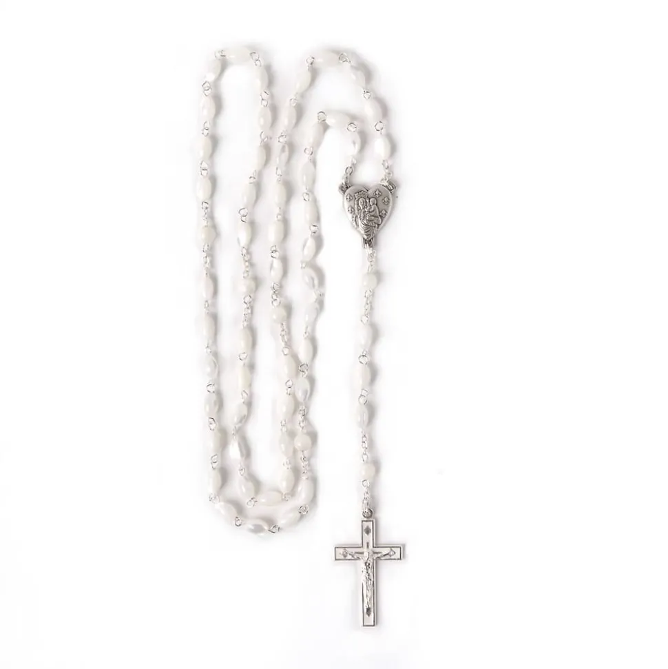 La boutique de Notre-Dame de Paris vous présente ce somptueux chapelet en perles de nacre blanche ovales, soigneusement montées sur un fil robuste et une chaîne en métal argenté. Chaque perle, d’une élégance naturelle, reflète la pureté et la simplicité du chapelet, tout en apportant une touche de raffinement.
