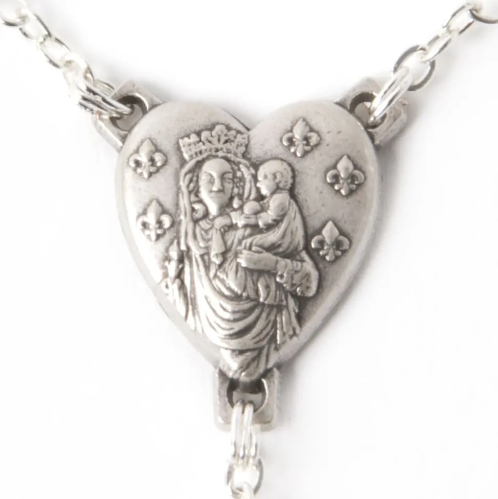 Le cœur du chapelet, également en métal argenté, est finement travaillé en forme de cœur, ce qui ajoute une dimension symbolique et émotionnelle à cette pièce unique. En y portant une attention particulière, vous découvrirez une effigie de la Vierge Marie tenant l’enfant Jésus sur le recto, et la majestueuse façade de la cathédrale Notre-Dame de Paris sur le verso.