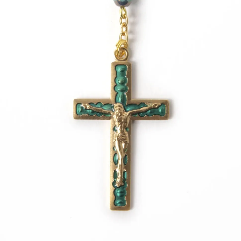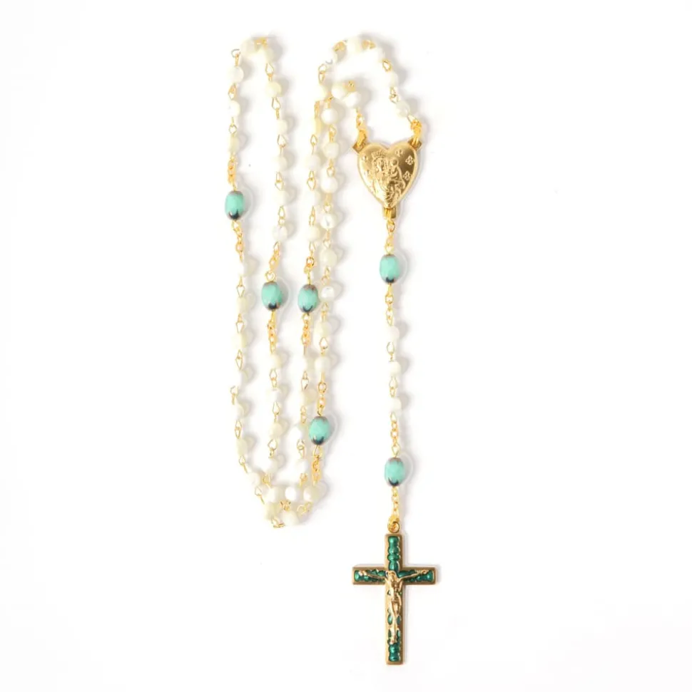 Les perles rondes en nacre véritable et turquoise offrent un contraste harmonieux entre la douceur nacrée et l’éclat bleu-vert de la turquoise, créant un objet à la fois magnifique et spirituellement significatif. La croix, sobre et d’un vert délicat, apporte une touche classique à cet ensemble.