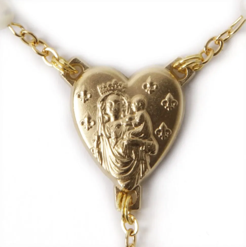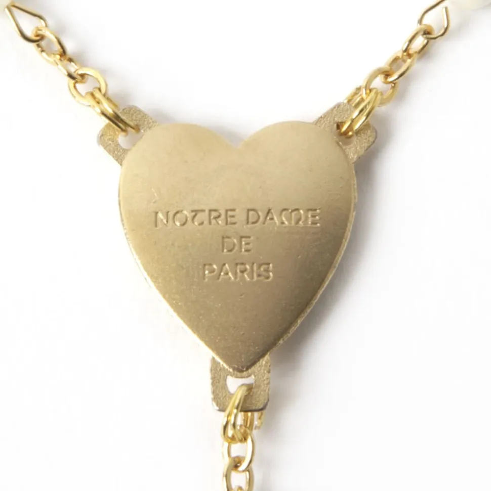 Le cœur du chapelet, doré et en forme de cœur, présente au recto l’image de la Vierge du Pilier, symbole de protection et de dévotion. Au verso, on trouve l’inscription « Notre-Dame de Paris », un hommage à la cathédrale emblématique.
