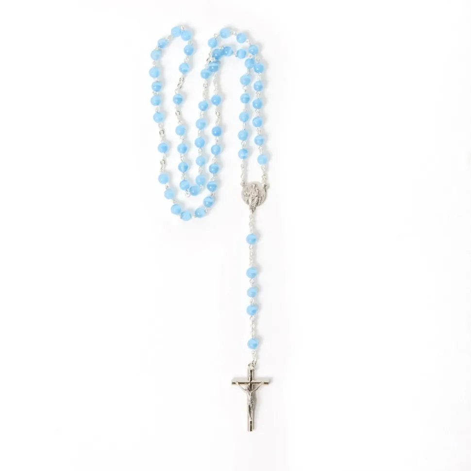 Ce chapelet argenté est fabriqué avec des perles « œil de chat » bleue, qui sont des pierres semi-précieuses caractérisées par un effet optique appelé chatoyance. Ce phénomène crée une bande lumineuse qui traverse la surface de la pierre, rappelant la pupille verticale d’un chat, d’où le nom « œil de chat ».