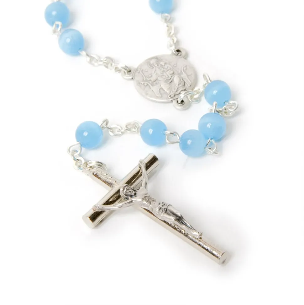 Chapelet monté sur chaîne en laiton argenté – Perles d’un bleu magnifique, rondes de 6 mm.