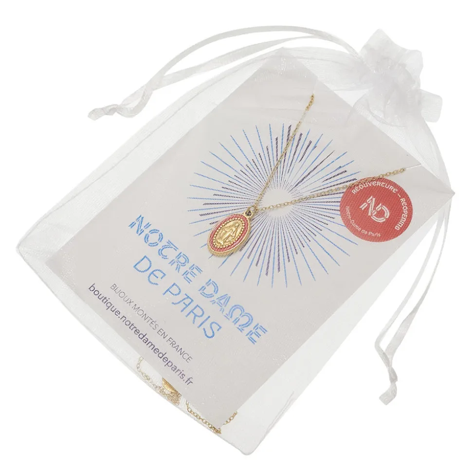Un collier doré médaille miraculeuse au design spirituel et élégant; en acier inoxydable a été spécialement conçu pour la réouverture de notre belle cathédrale. Une manière de rendre hommage à La Vierge Marie. Ce bijou de cou met en valeur la Vierge Marie, auréolée d’un cercle rose fuchsia, symbole universel de protection et de bienveillance. Ce bijou religieux, à la fois intemporel et élégant permet de garder votre foi près de votre cœur.