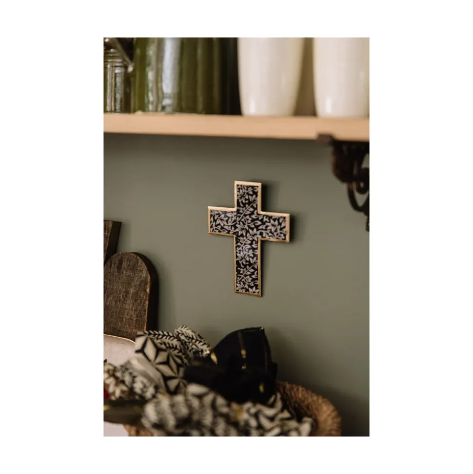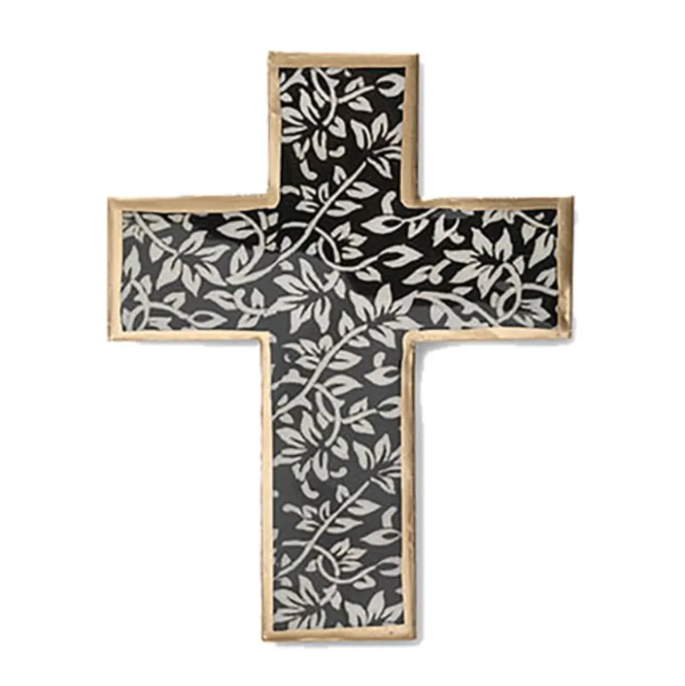 Croix murale en aluminium émaillée noire aux motifs dorés très fins et élégants.