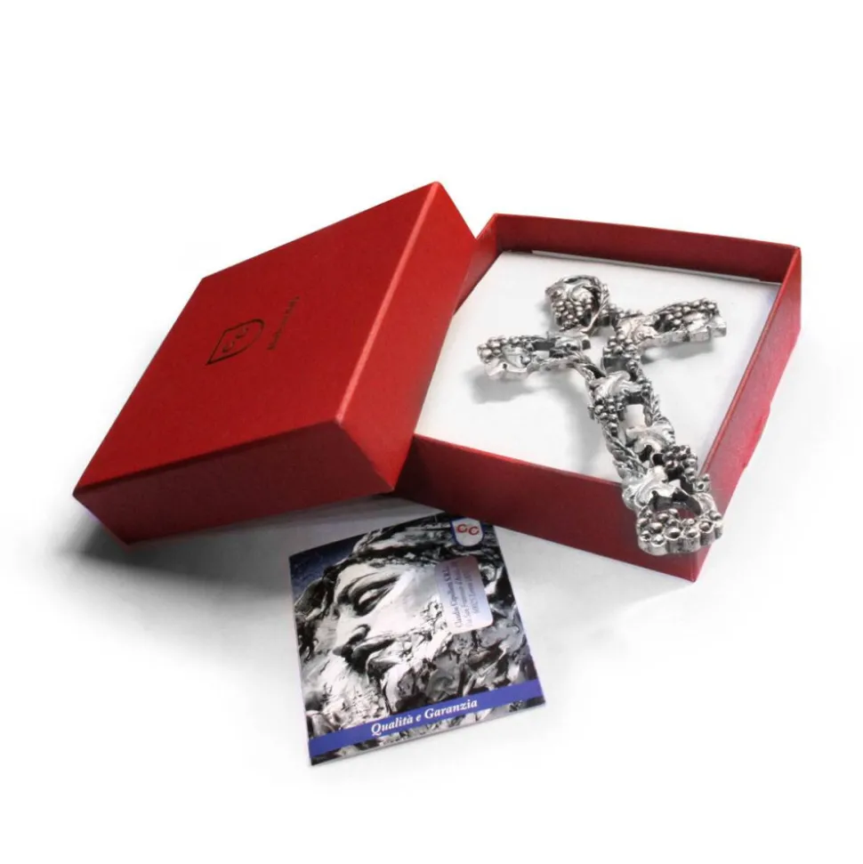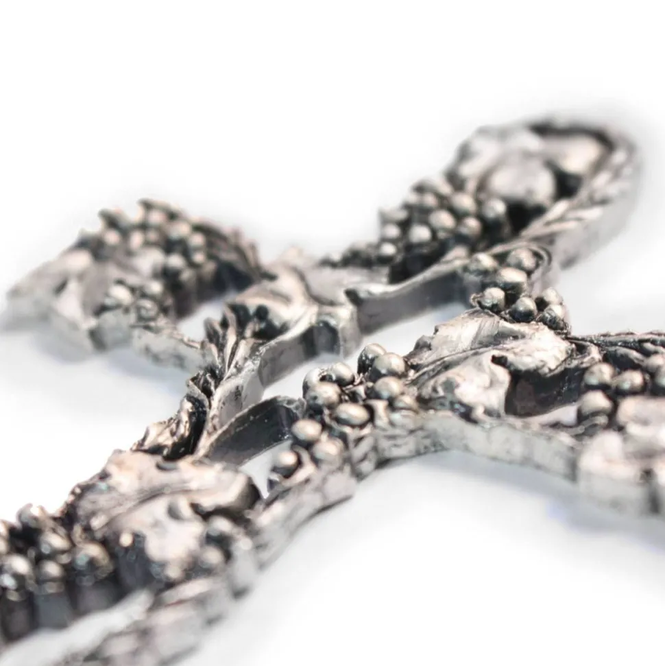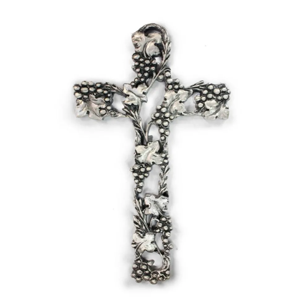 Croix en métal argenté à décors de sarments de vigne ajourés.