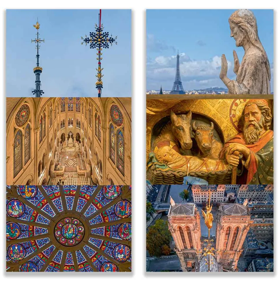 Les photographies sont saisissantes et nous donne un aperçu de la beauté incontestée de notre cathédrale. Vous pourrez admirer, lors de votre visite à Notre-Dame et sur ces cartes souvenirs : Le nouveau coq en bronze doré et un morceau de la flèche; les murs du Chœur nettoyés retrouvant leur clarté; la restauration minutieuse du vitrail rosace du transept nord; la posture de la statue de Christ comme une bénédiction pour Paris; la restauration de la crèche sculptée dans le bois datant du 15e siècle et enfin la vue aérienne sud-est de Notre-Dame avec le cog doré surplombant la photo.