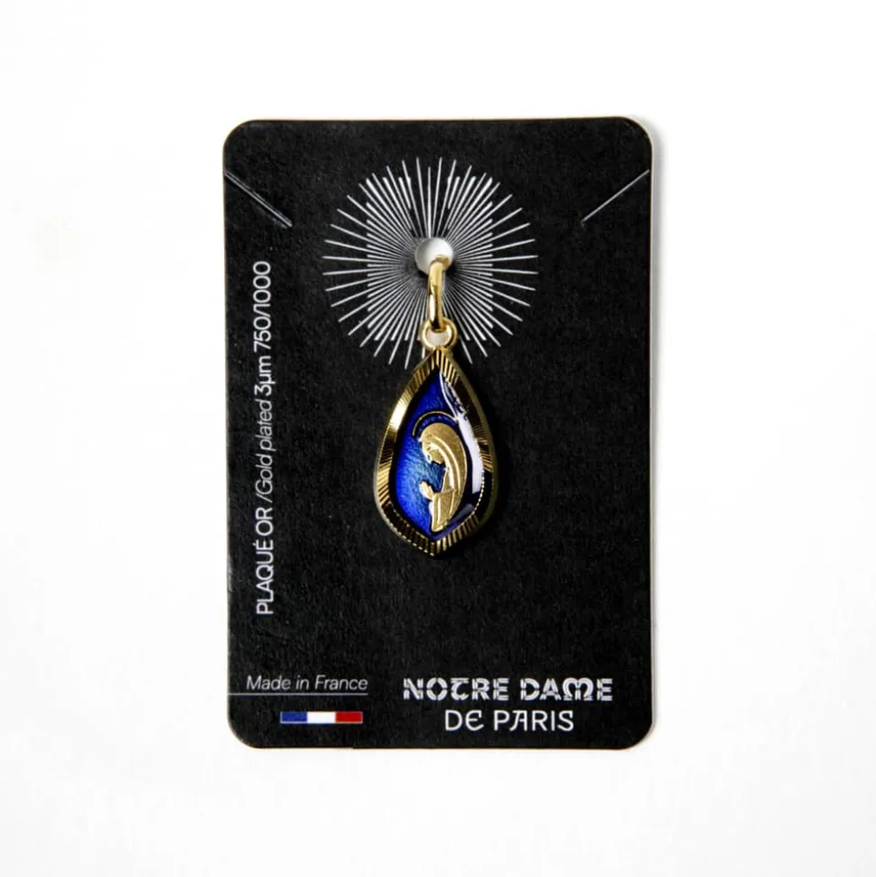 La médaille aux fines découpes sur fond bleu, mesurant 10 x 17 mm, se distingue par son motif de la Vierge dans une finition mate, parfaitement mise en valeur par une bordure satinée.
