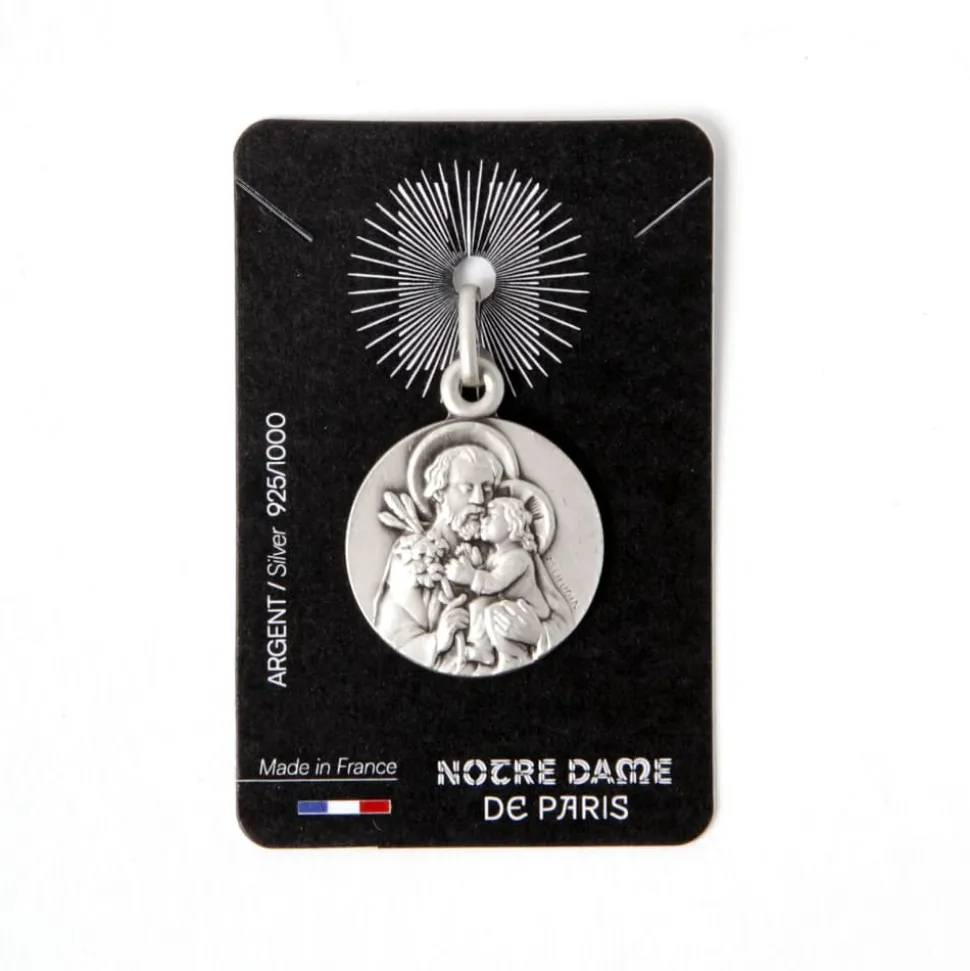 Découvrez notre magnifique médaille Notre Dame en argent, d’un diamètre de 18 mm, représentant Saint Joseph tenant l’enfant Jésus dans ses bras.