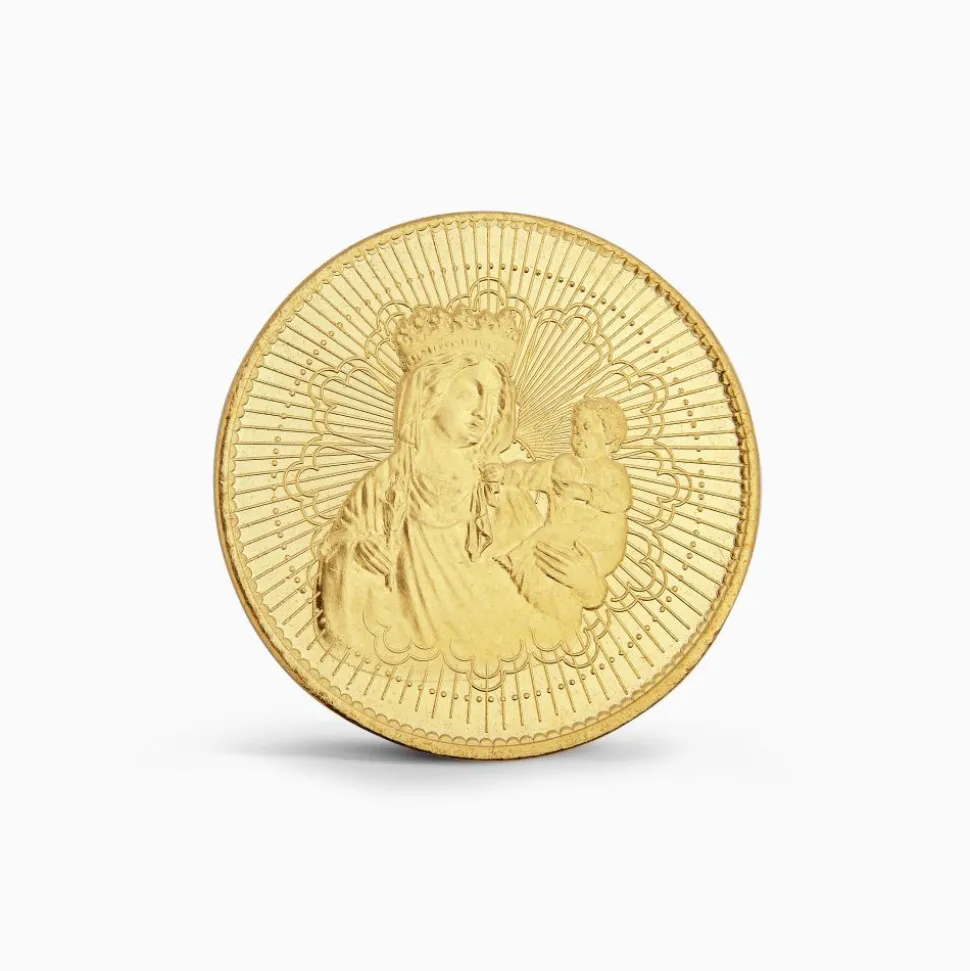 Médaille de collection représentant la figure emblématique de notre belle cathédrale : Notre Dame, dite La Vierge à L’Enfant ou Vierge du Pilier. Sur cette médaille, est rendue visible également la rosace. C’est une pièce de collection symbolisant fortement l’aura de la statue Notre Dame de Paris. C’est une représentation classique de la Vierge Marie tenant l’Enfant Jésus. Elle est souvent associée aux symboles de piété et de protection.