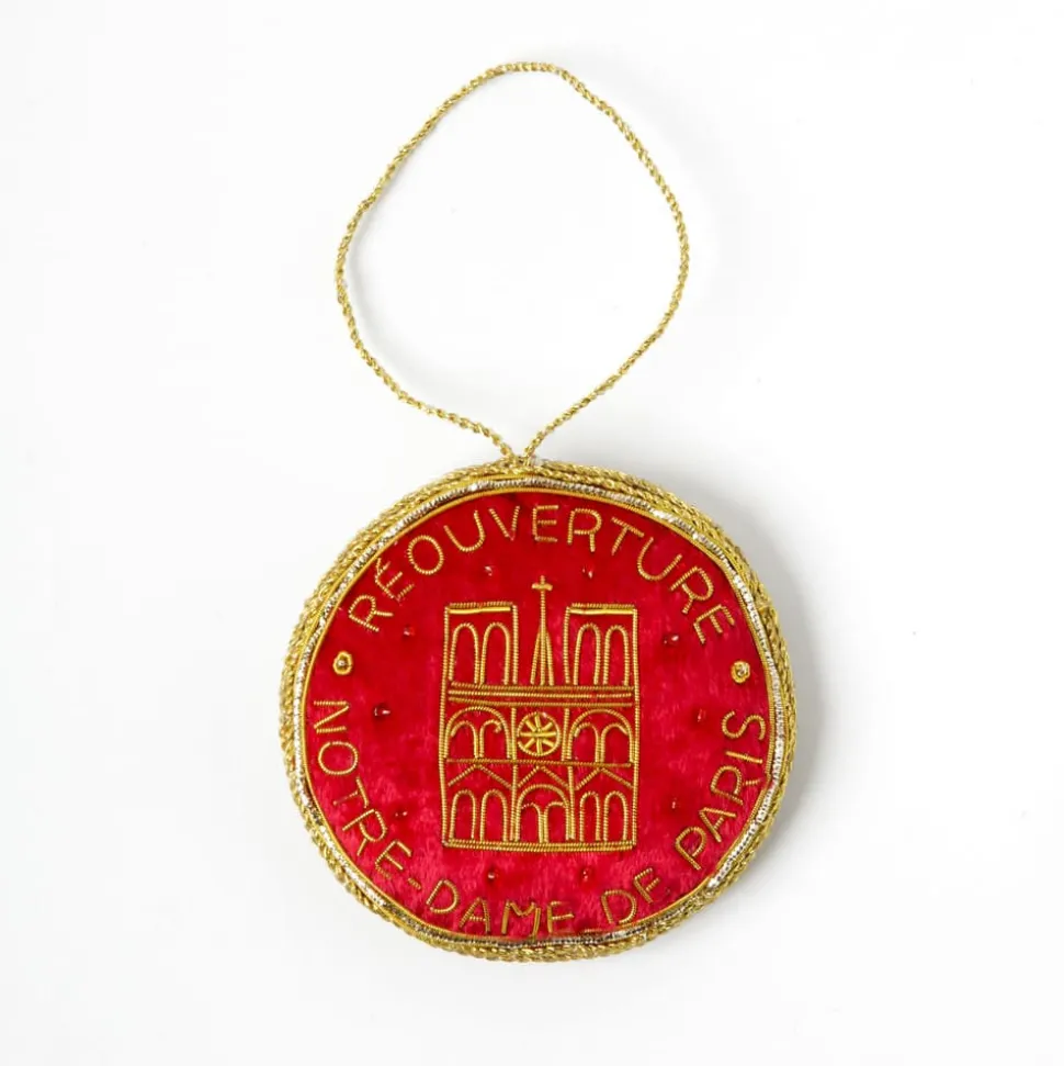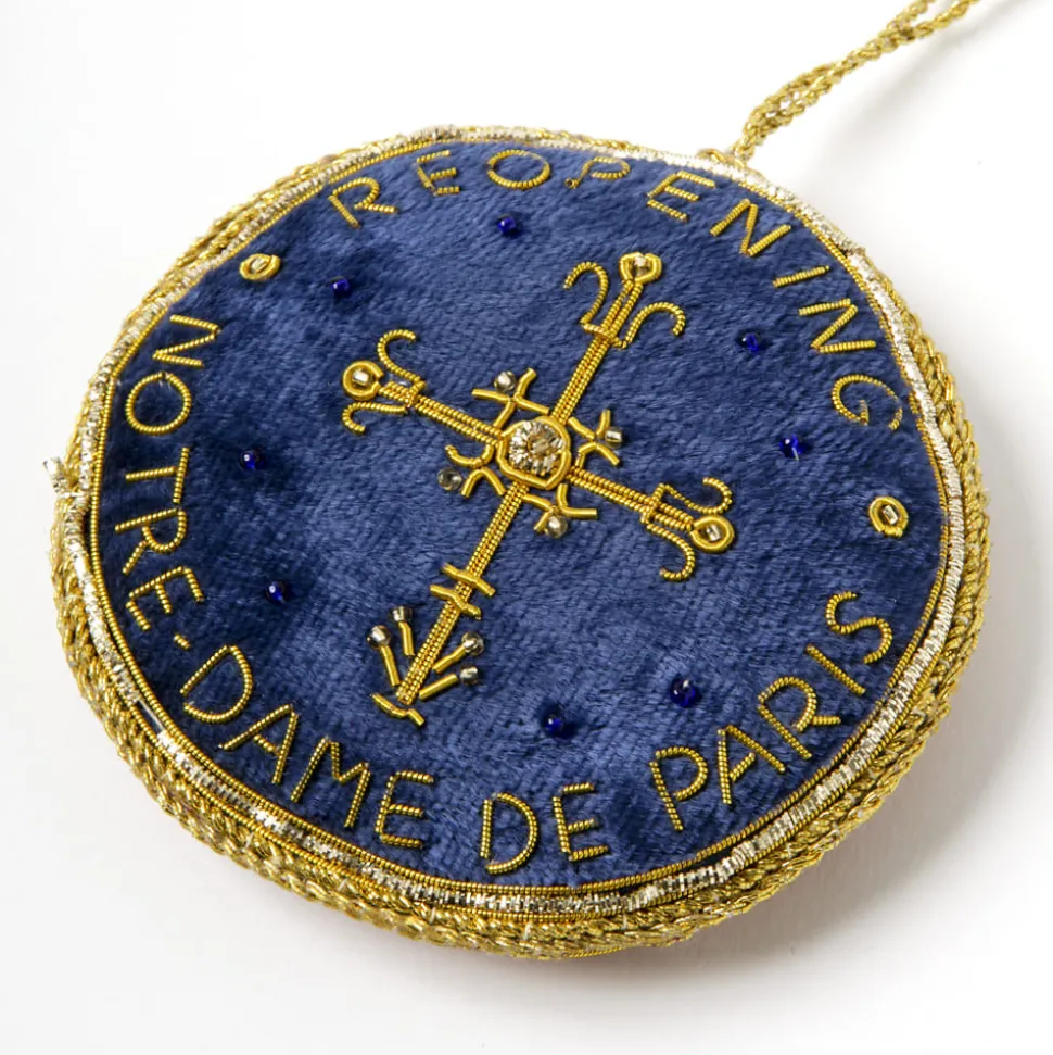 Entièrement brodée à la main dans une technique artisanale très ancienne suivant des valeurs éthiques liées au commerce équitable, cette décoration est fabriquée à la main et est personnalisée pour la réouverture de la Cathédrale Notre Dame de Paris.