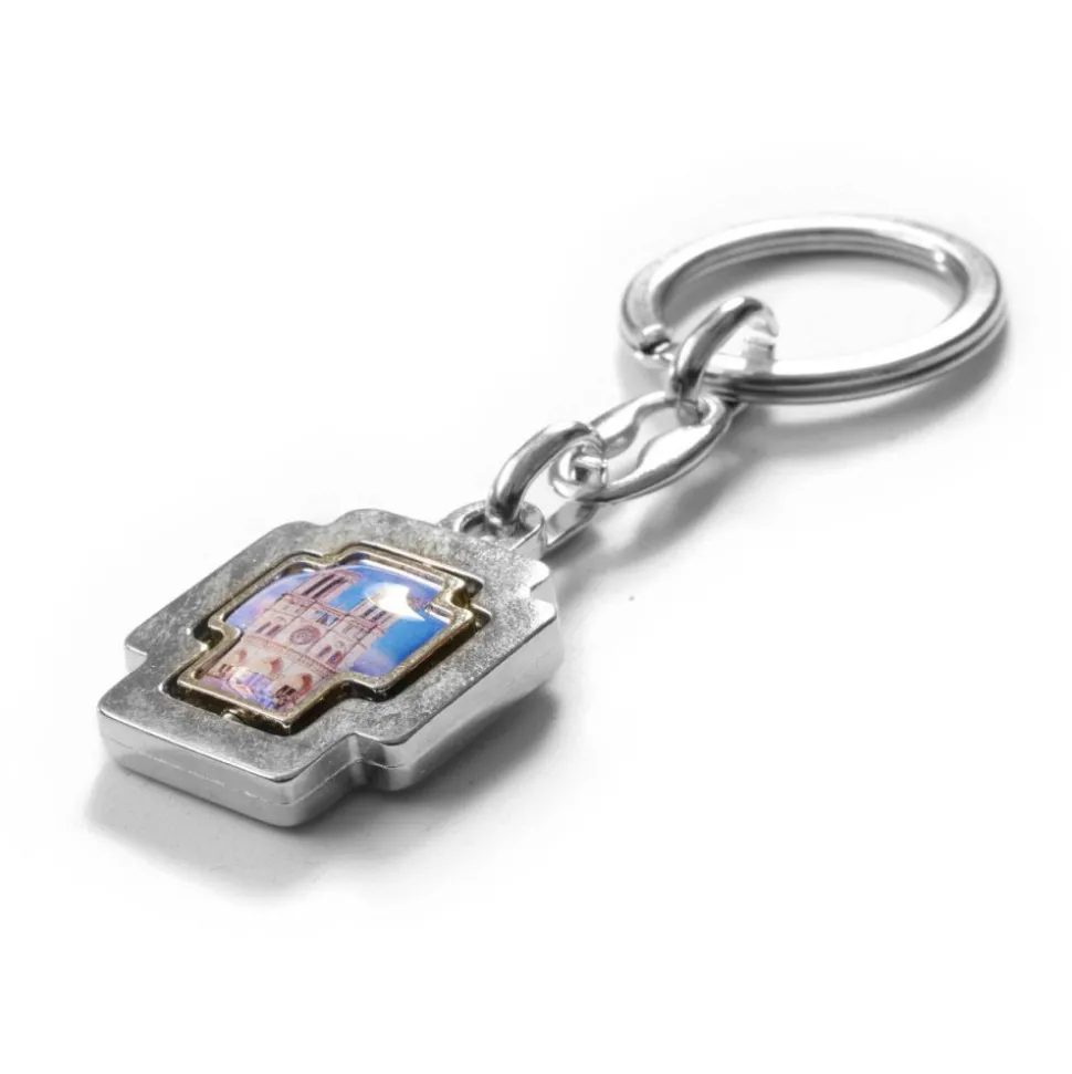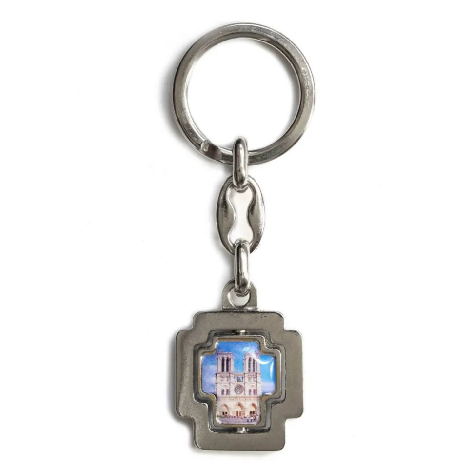 La croix argentée donne un éclat particulier aux images de la cathédrale Notre-Dame de Paris qui ornent le centre du porte-clés.