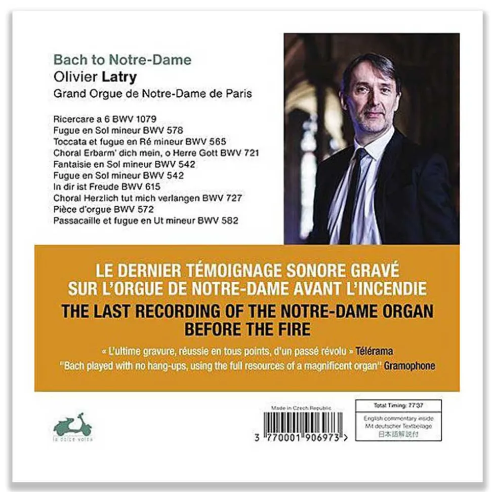 Ce CD de musique lui rend hommage. C’est le dernier témoignage sonore gravé sur l’orgue avant l’incendie. Olivier Latry magnifie l’œuvre de Jean-Sébastien Bach. Ce CD est une réédition; la première datant de 2019 (« Bach to future »), donc avant l’incendie. Cette version est remastérisée car après l’incendie, une nouvelle dimension, plus symbolique, s’est ajoutée : celle d’un dernier témoignage d’un passé désormais révolu.