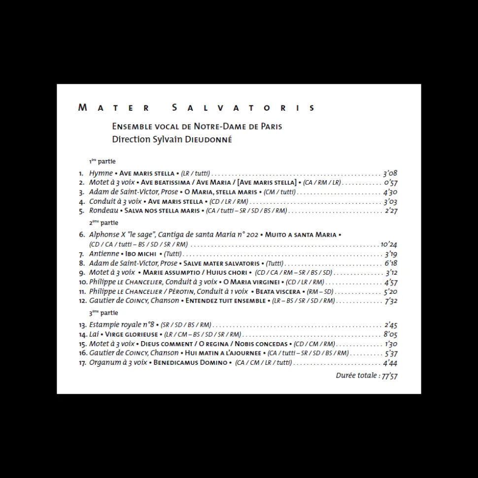L’année 2013 voit la commémoration des 850 ans de la cathédrale Notre-Dame de Paris. Pour cette occasion, l’Ensemble vocal de Notre-Dame de Paris, dirigé par Sylvain Dieudonné, publie Mater Salvatoris, un enregistrement à la thématique mariale, dédié à l’univers musical des XIIe et XIIIe siècles et qui met en lumière certaines personnalités ou musiques en rapport avec la cathédrale.