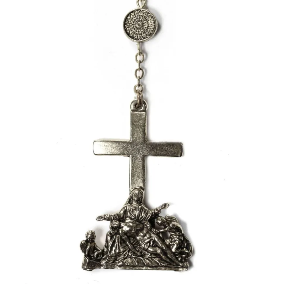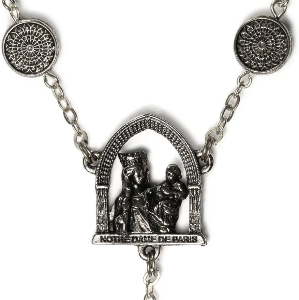 Fabriqué artisanalement, ce chapelet reprend quatre grands éléments de Notre-Dame de Paris : les rosaces des vitraux, la Pietà, la croix glorieuse et le portail gothique.