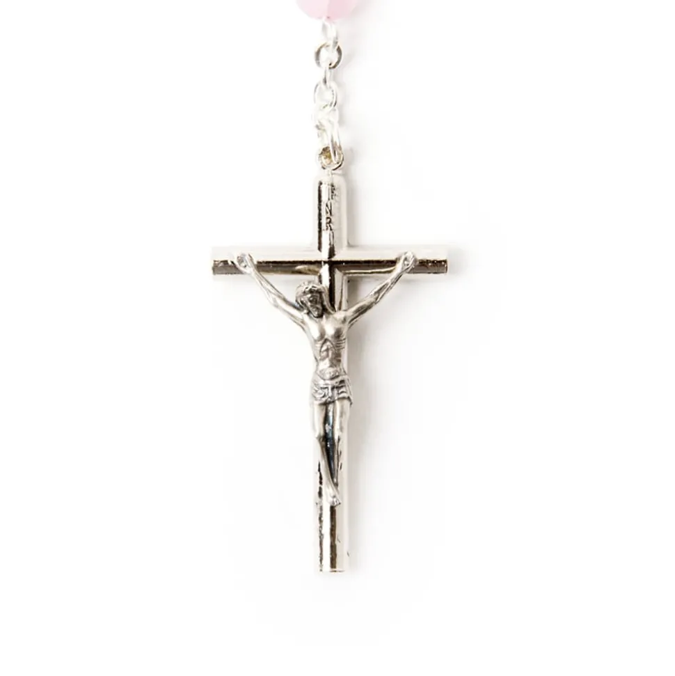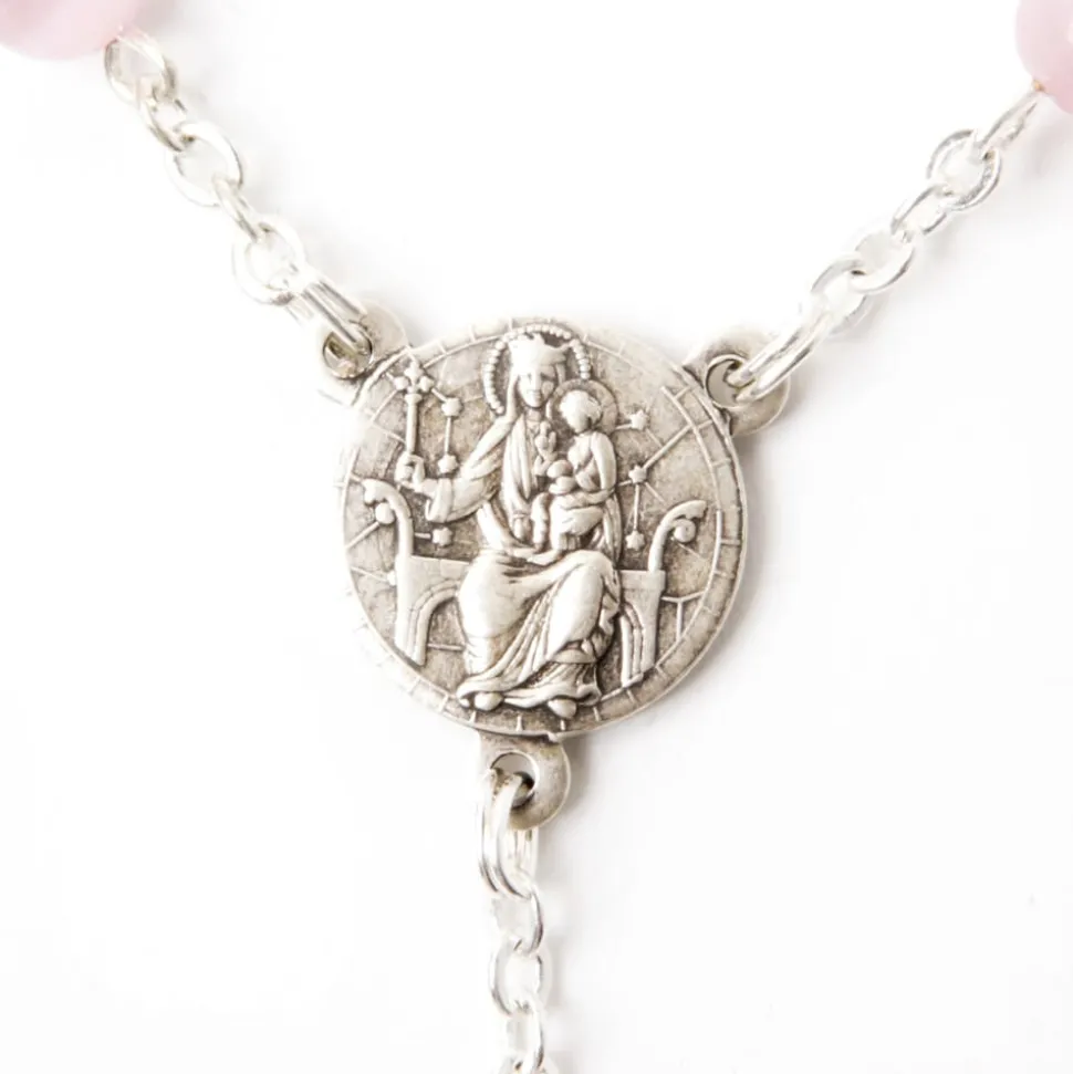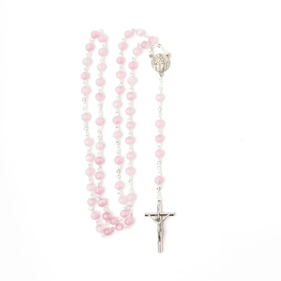 Monté sur une chaîne en laiton argenté, ce chapelet se distingue par ses perles rondes de 6 mm, d’un magnifique rose.