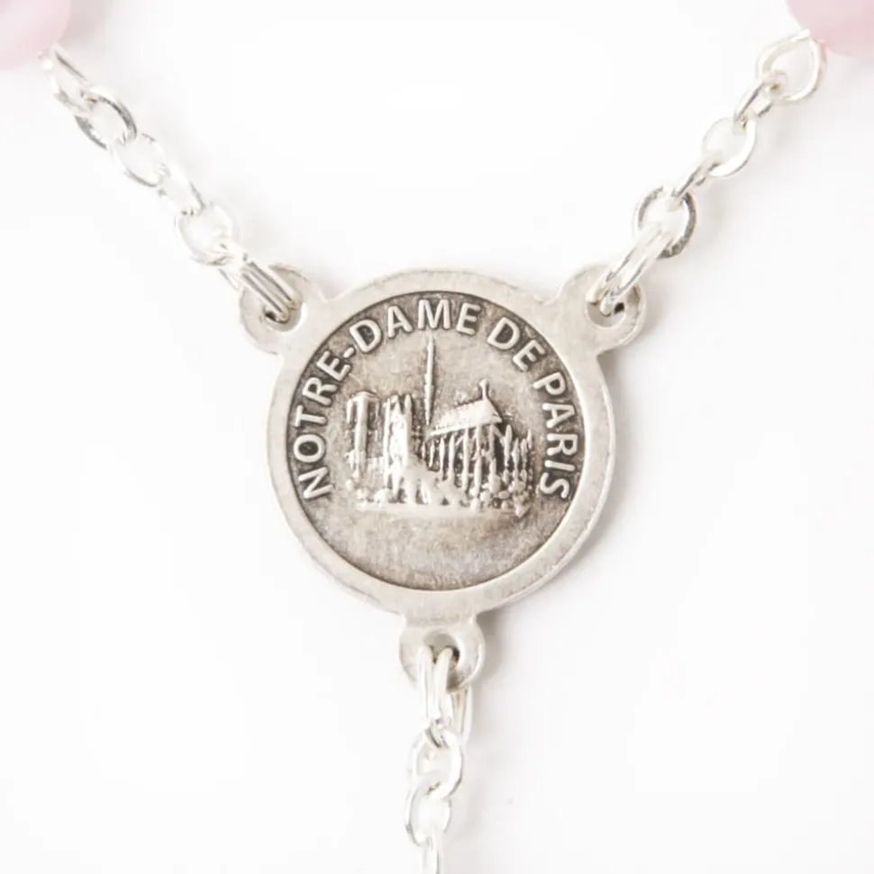 Au cœur de ce chapelet, vous trouverez la Vierge à l’enfant, fidèle représentation de la Vierge du vitrail de la Rosace Ouest présent dans la Cathédrale Notre Dame de Paris.