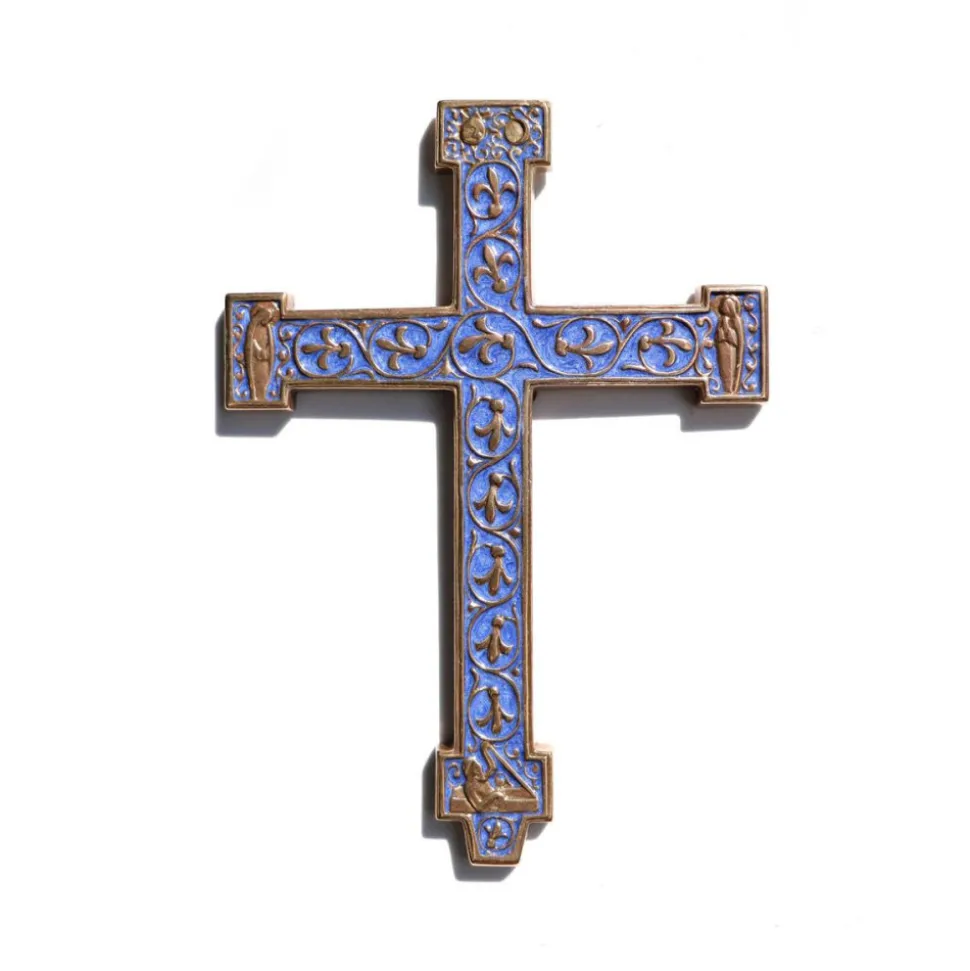 Cette délicate croix crucifix en bronze d’un bleu céleste est fabriquée à la main en France.