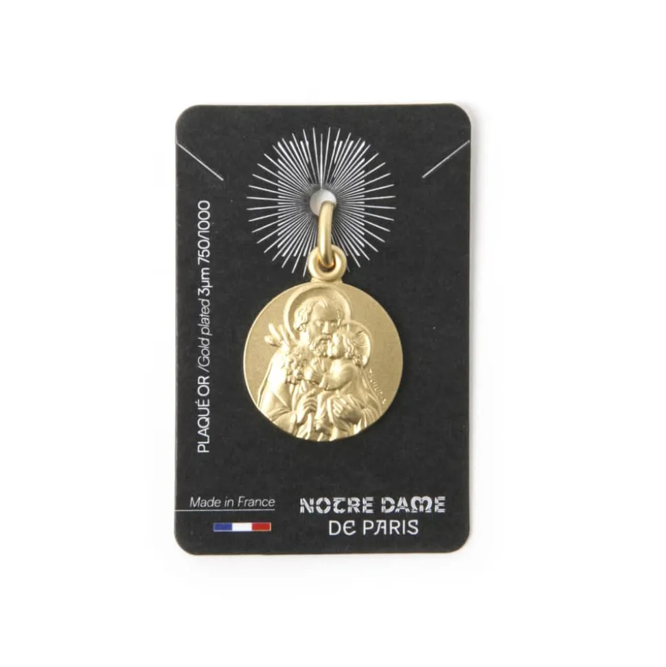 Découvrez notre magnifique médaille Notre Dame en plaqué or, d’un diamètre de 18 mm, représentant Saint Joseph tenant l’enfant Jésus dans ses bras. Cette pièce unique illustre Saint Joseph, symbolisant la protection et la sagesse, dans une représentation empreinte de piété et de sérénité.