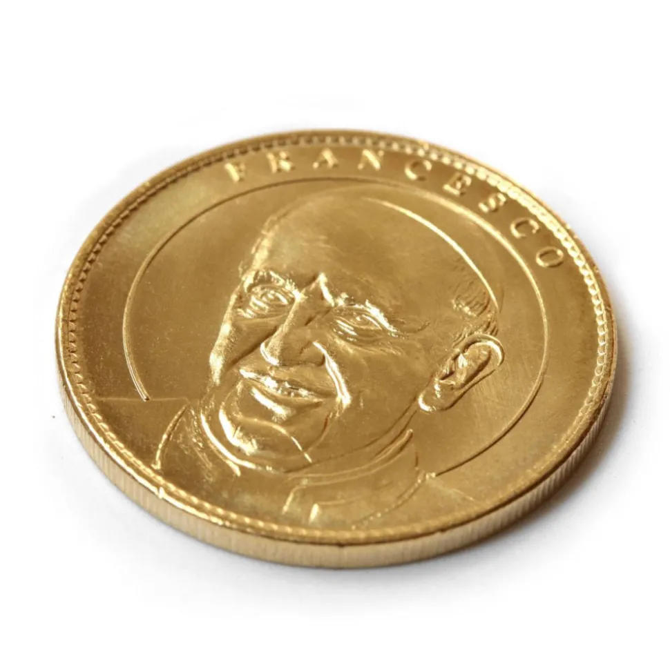 Après avoir été soigneusement dessinées et sculptées, les flancs de métal d’orfèvrerie sont estampés au modèle et découpés à la forme. Médaille représentant au recto le Pape François et au verso Saint Jean-Paul II avec en arrière plan la façade de la cathédrale.