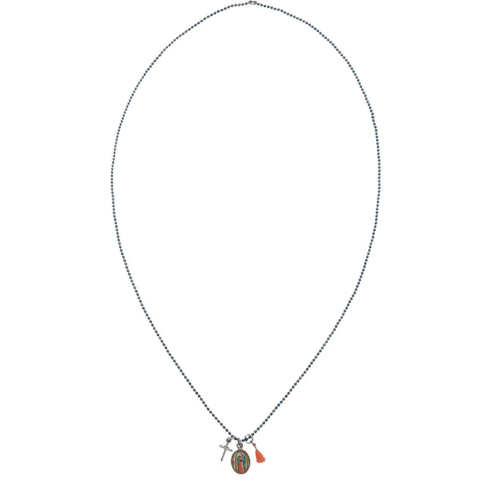 Un collier sautoir guadalupe au style original et coloré dédié à la foi chrétienne. Ce collier est conçu avec des petites perles en laiton, couleur bleu, orné d’une médaille de La Vierge de Guadalupe, d’une croix latine argentée et d’une pampille rouge.