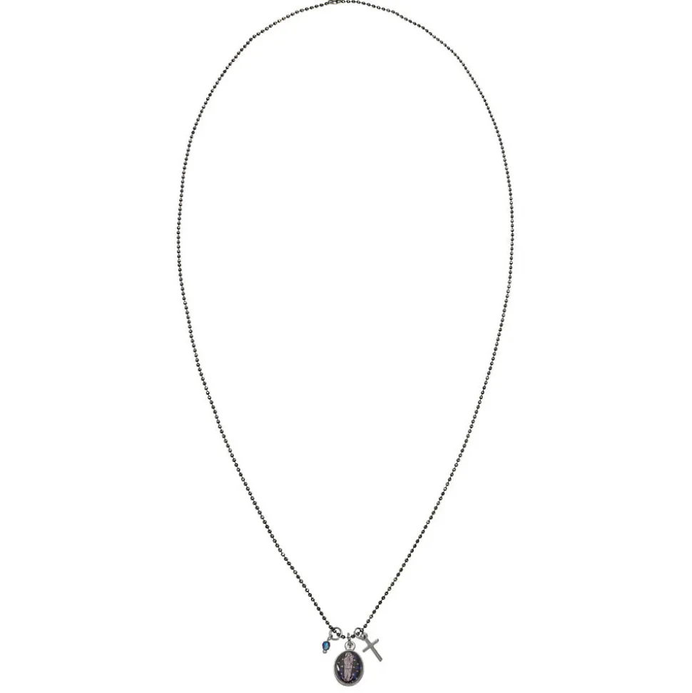Un collier sautoir au style original, conçu avec des petites perles en laiton, couleur noir, orné d’une médaille de La Vierge de l’Oculus, d’une croix latine argentée et d’une pampille bleue.