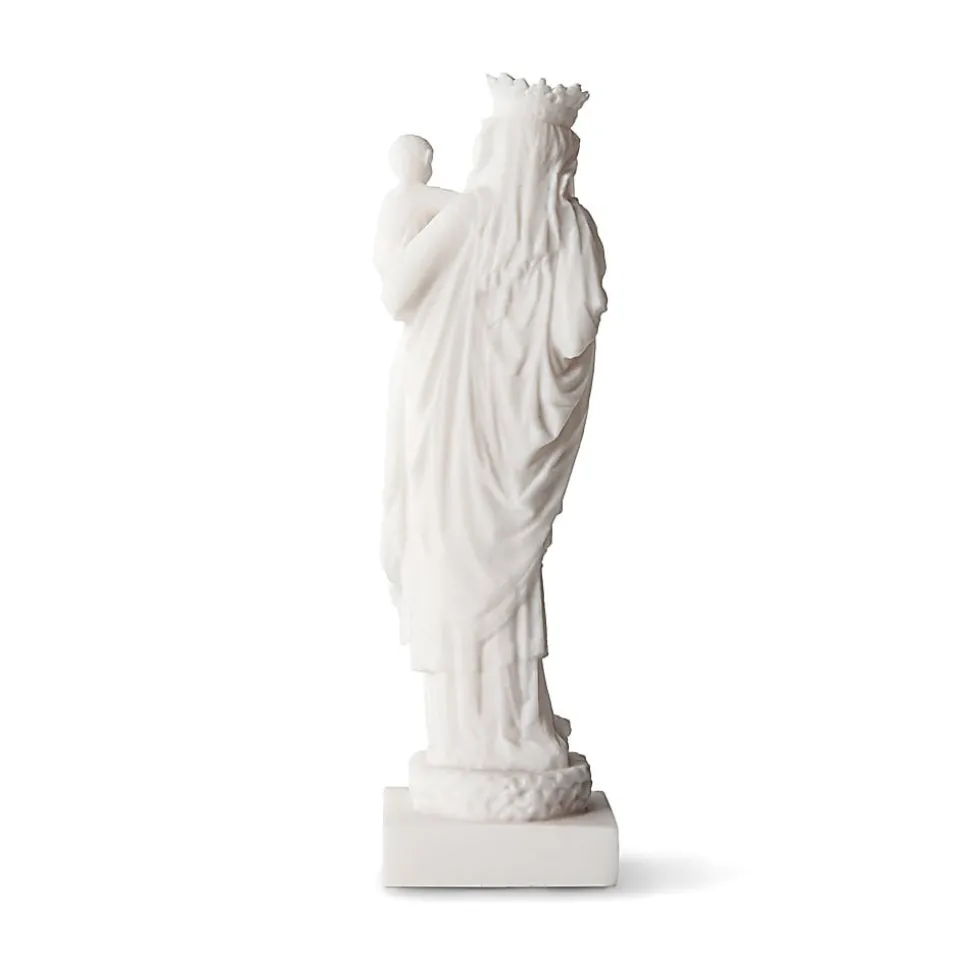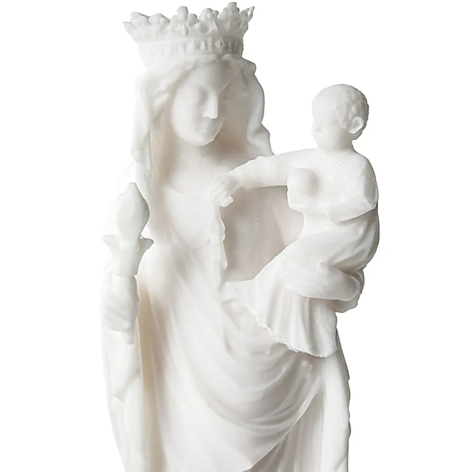 Cette superbe statue de la Vierge Marie à l’enfant en albâtre est une reproduction exacte de la statue Notre Dame, dite aussi Vierge du pilier. Très soignée dans les moindres détails (visage, mains), lui conférant un caractère très réaliste, elle accompagnera vos prières dans toute les pièces de votre maison.